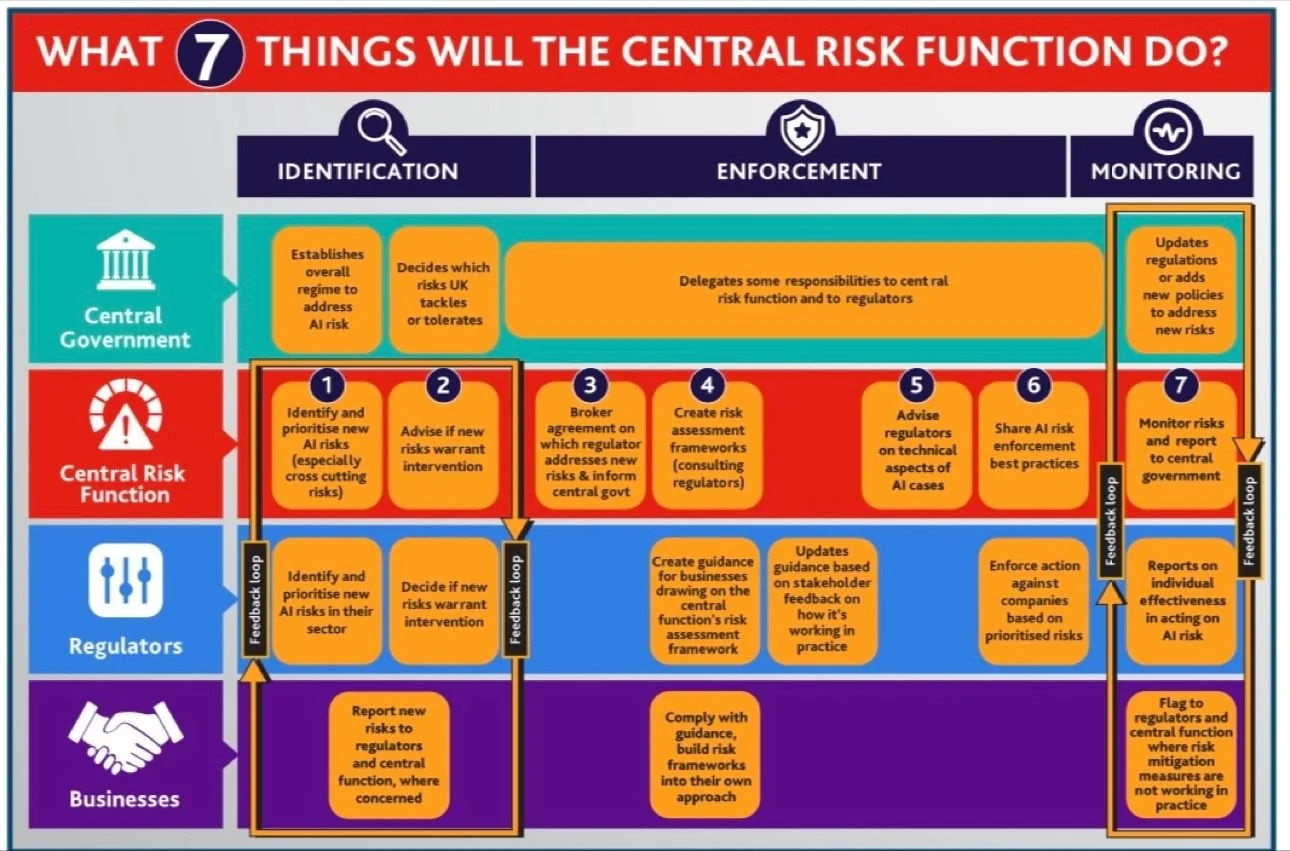 Organisations can adopt a central monitoring and evaluation (M&E) function to manage AI risk (see diagram below, source: UK White Paper on AI Regulation).